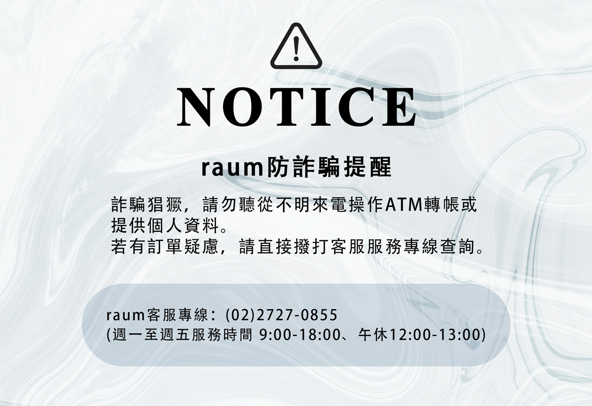 raum 不會以電話主動要求您操作ATM提款機進行轉帳及設定、團購或是會員等級等問題要求帳戶資料取消訂單錯誤金額, 也不會以電話通知刷卡問題,倘若您接獲不明人士假冒raum客服,謊稱訂單設定錯誤、付款方式分期設定錯誤、退款通知,以上皆為網路詐騙手法,請會員們提高警覺!